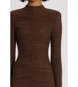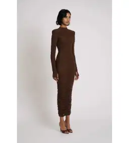 The fitted silhouette hugs your figure, and the midi length adds a timeless, elegant touch. Thumb holes and ruching detailing provide a contemporary edge, making this dress both unique and fashionable.
