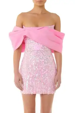 "The Bianca Dress designed in an embellished sequin and candy pink drill fabrication features a mini slim fitting silhouette with a statement off the shoulder bow. This statement mini is complete with stretch jersey lining and an exposed zipper at the centre back.
