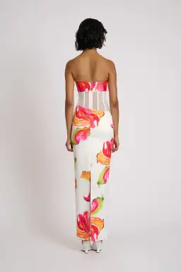The mesh corset waist beautifully contours your silhouette, cascading into a full-length skirt.