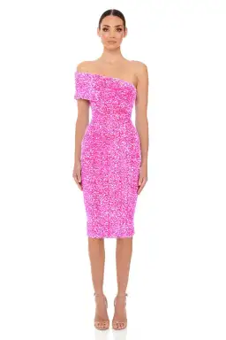 The Alyssa Dress is designed in a richly embellished sequin and features a flattering bodycon silhouette and asymmetrical one shoulder neckline.