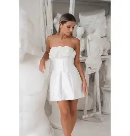 The Tehanni Dress features a strapless neckline and fitted corset bodice which effortlessly cascades into a full mini skirt. The focal point is the bust which is adorned with handcrafted scattered flower embellishments. Fully lined with an invisible zipper at the centre back, the Tehanni Dress is the embodiment of contemporary refinement and timeless beauty.