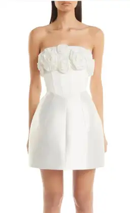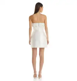 Featuring a strapless neckline, fitted bodice & simple A-line mini skirt, this dress is an absolute yes for any of your bridal events. The focal point is the bust which is adorned with handcrafted scattered flowers.