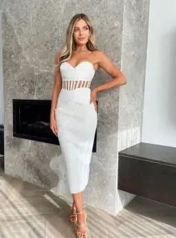 This body hugging long-line silhouette features an intricate strapless bodice leading into a cinched corset waist. Complete with a centre back exposed metal zipper, this white midi is elegant and romantic perfect for an engagement party or special event.