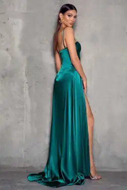 Sweetheart fluid satin gown features detachable straps, knotted bust detail and high side split - emerald green