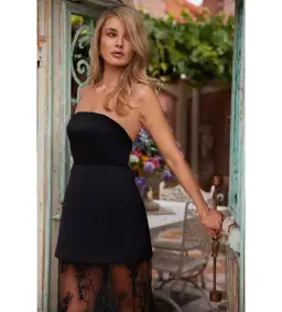 Make a bold impression in this captivating strapless dress, featuring a sleek top with a charming small bow detail at the back. The elegant design flows into a stunning sheer lace skirt, adorned with intricate detailing.