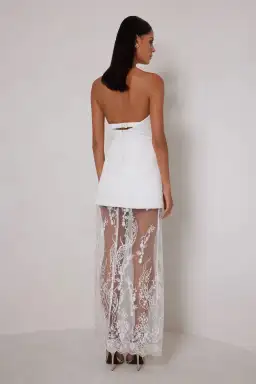 Make a bold impression in this captivating strapless dress, featuring a sleek top with a charming small bow detail at the back. The elegant design flows into a stunning sheer lace skirt, adorned with intricate detailing.