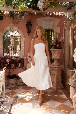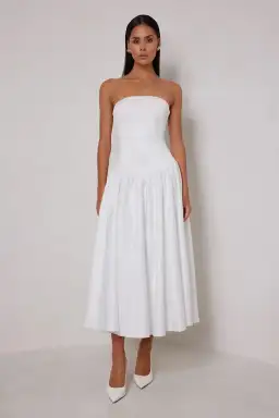 Make a statement with this elegant strapless white midi dress, crafted for modern sophistication. The fitted bodice provides a sleek and flattering silhouette, transitioning into a voluminous, gathered skirt that adds playful movement.