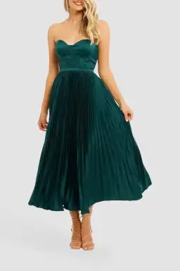 Elle Zeitoune has designed the ideal pleated gown for those who want to make a statement at their next cocktail or evening event. This dress showcases emerald green satin, a graceful bodice, and a silk-like touch. It offers a pleated skirt and a feminine bodice, combining both style and comfort.