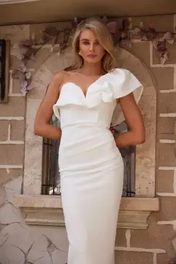 This stunning dress is expertly crafted from thick fabric for a flattering fit. The unique asymmetrical design features a dramatic ruffle detail with a textured finish on the one shoulder. The structured bodice hugs your curves perfectly.