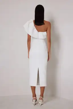 This stunning dress is expertly crafted from thick fabric for a flattering fit. The unique asymmetrical design features a dramatic ruffle detail with a textured finish on the one shoulder. The structured bodice hugs your curves perfectly.