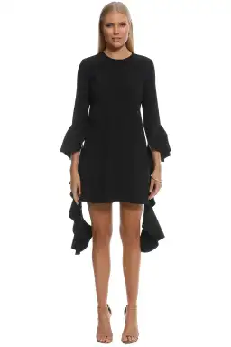 Ellery’s modern feminine aesthetic is perfectly captured in the Kilkenny Dress. The chic little black dress features a round neck and three-quarter length sleeves with asymmetric ruffles cascading down the side.