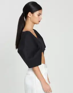 From the label's runway collection, a black crop top in fine Japanese twill cotton, fashioned with sculptural sleeves for a statement silhouette.