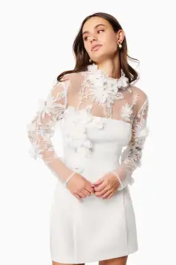 With its long sleeves, the Damaris dress offers a perfect balance of modesty and allure, making it an ideal choice for various occasions. The mini length adds a flirty and youthful vibe, while the 3D floral trims add a whimsical touch to the ensemble. Whether you're attending a cocktail party, graduation, or a special date night, the Damaris 3D Beaded Mesh Mini Dress guarantees to turn heads and make a lasting impression. Step into the spotlight with this chic and timeless piece that defines modern femininity.