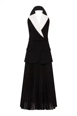 - Smooth durable fabric- Pleated midi skirt- Halter neck- Contrasting white collar- Belted waist- Sleeveless