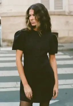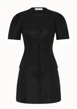 A classic mini dress with a high neckline and oversized cap sleeves with subtle gathering at the top. Designed from a signature 100% European flax linen fabrication.