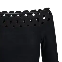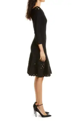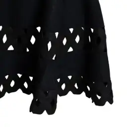 - Short black dress embellished with cut edges. Model with boat neckline, three-quarter sleeves and flared soft skirt.