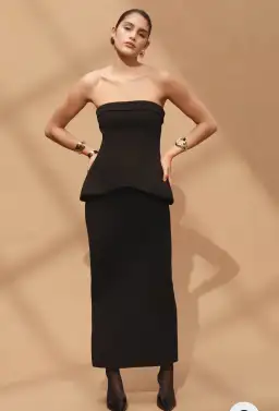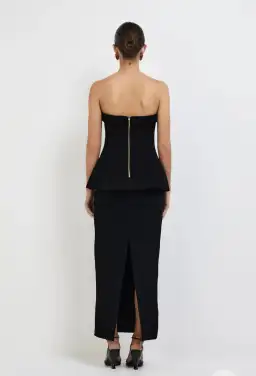 A masterclass in structured elegance. Introducing the Estella Gown - showcasing a black bonded fabrication, straight strapless neckline with fold over detail, peplum, column shaped maxi skirt with back split, and exposed back zipper.