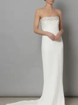 Delicate diamanté beading embroidered entirely by hand with silk organza-covered glass stones, pearls, sequins, and crystals embellish the top of this slim-fitted strapless corset gown in a sleek stretch crepe—lined in silk satin.