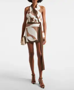 Halter neck, Relaxed fit, Open back, Wrap front opening with tie, Breathable lightweight silk crepe fabrication, Exclusive SIR. print engineered to garment.