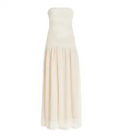 The Colette Dress is made from a super soft, stretchy, and comfortable crochet knit fabric. A strapless pull-on design with a flattering low back with elastic inside silk casing for support. Fully lined in our nylon mesh, the dress is made from custom hand beaded cotton crochet.