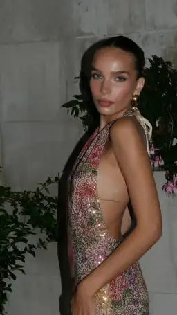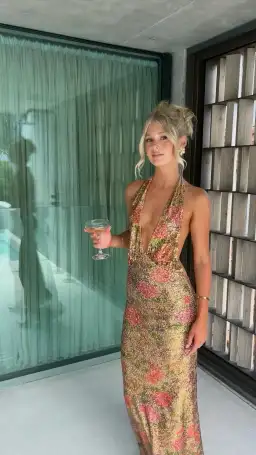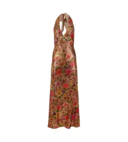 Stretch sequin fabric in Fleur print, V-neck empire seam halter with gathered bust, Fully lined in our (core) soft nylon mesh , Adjustable halter ties made of 100% silk charmeuse, Full length gown, Low rounded-back design.