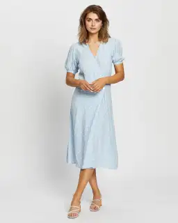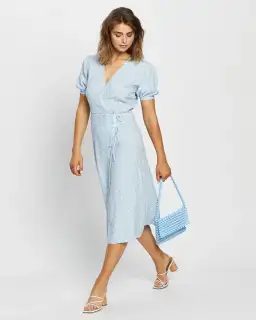 Midi length wrap dress with button detail, ties on the waist, short puff sleeves.