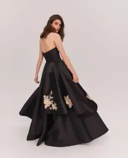 Gold embroidery takes The Nova from classic to current. This is maxi gown featuring a structured bodice, a defined waist, and a structured ruffle overlay. It has boning in the bodice and an invisible zip closure.