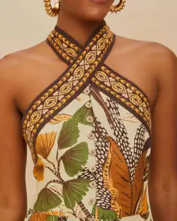 Farm Rio bursts with tropical prints and bold color combinations that bring a carnival-like energy to every collection. The Halter Neck Mini Dress showcases vibrant patterns and a fitted halter neckline, creating an eye-catching silhouette with a breezy, playful finish.