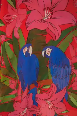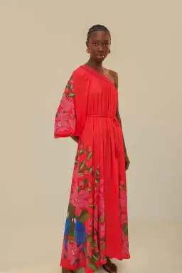 Embrace the vibrancy of summer with the Red Summer Foliage Scarf Maxi Dress, a tropical delight by FARM Rio. Drenched in a bold red hue, this one-shoulder piece boasts a flamboyant floral and parrot print that promises to turn heads. The flowing scarf sleeve adds a touch of effortless elegance while the maxi length skirt invites a graceful sway with every step. This dress captures the essence of sun-soaked days and balmy evenings, perfect for making memorable moments.