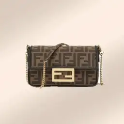 Iconic mini Baguette bag made of brown jacquard fabric with an FF motif, decorated with an FF clasp and trimmed with black embroidery.Featuring a front flap, magnetic clasp, unlined internal compartment with pocket and gold-finish metalware. The long chain strap is detachable.