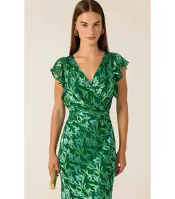 The Fleur De Lys Dress is made from a luxurious silk rayon in an exclusive SACHA DRAKE print, featuring a faux wrap top, fluted sleeves, and a bias-cut skirt that skims the body. With an elasticated waist and crystal-accented self-tie belt, this satin-lined midi is perfect for weddings and elegant events.