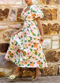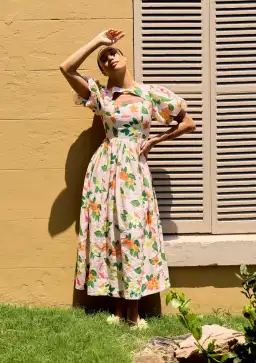 The Frangipani Puff Sleeve Dress has a fitted bodice and features short puffy sleeves. The bodice features a chest cutout with a small bow detail at the neck. The skirt is long and gathered at the waist with an invisible centre back zip closure. The dress is a fully lined, lightweight Linen dress created in IL's exclusive Hibiscus print. This Linen is soft and sheer, giving the dress a light and floaty feel.