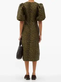 Ganni Puff Sleeve Leopard Jacquard Midi Dress Print Size 44
