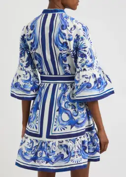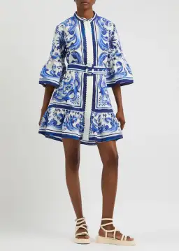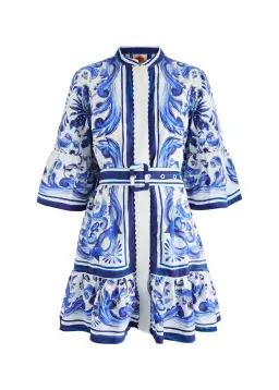 Brand new with tag Embrace the enchanting aura of the Garden Tiles Off-White Mini Dress with its eye-catching blue tile-inspired patterns set against a soft off-white backdrop. This dress features a flattering high neckline, playful bell sleeves, and a chic belted waist that accentuates your silhouette. Its fluid hemline sways with grace, making it an effortlessly romantic choice for sun-soaked days or balmy evenings. Composition: 100% COTTON