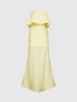 A golden hour glow! Introducing the Gemini Dress - showcasing a lemon bonded stretch fabrication, fit and flare styling, strapless with overlay flounce and sheer maxi skirt overlay. Pair with our Alicia Earrings to complete the look.