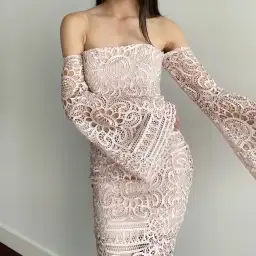 A romantic choice – perfect for cocktail parties, weddings and outdoor events. The fitted design echos an elegant style with a soft feminine silhouette, while the lustrous, soft pink lace and strapless neckline offer a modern twist. Not to mention -- The beautiful ornate bell sleeves.