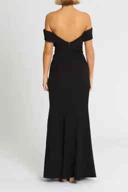 This stunning black floor-length gown by George is the epitome of elegance and timelessness. Its fit and flare silhouette is highlighted by a captivating crossover bodice detail and an off-the-shoulder neckline that beautifully complements the neckline. The gown gently dips at the back, revealing a subtle v-shape, and is secured with an invisible back zip closure. Ideal for renting for a black tie event or an elegant evening gala dinner party, it also features a mini length lining for added comfort and style.
