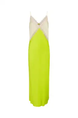 Sadie is a cult favourite GINIA style. Constructed from contrasting blocks of pop colour. The upper bust and back panels meet with an eyelash lace that harnesses the body, offering a flash of the form underneath. The midi-length skirt falls freely to the mid-calf. Finished with French seams throughout for an uninterrupted fall of the 100% silk fabric.