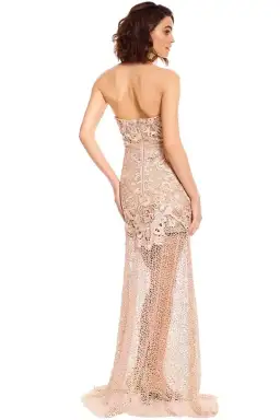The Adele gown, made from lovely blush lace with nude lining, will make you feel glamorous. With a mermaid silhouette that hugs the body to the hips, it features contrasting laces that flow into a floor-length skirt. This flirty gown is a great addition to your spring/summer wardrobe.