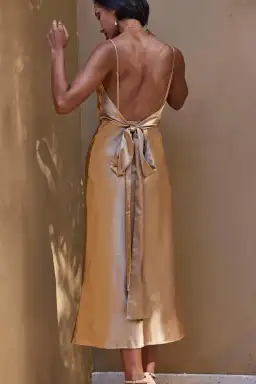 Anya is bias-cut from 95% recycled satin – a luxurious, fluid-like fabric that drapes effortlessly over the body. The barely-there satin rouleau straps can be fixed to your liking with the delicate, gold adjusters. Famed for its subtle, yet flattering, cowl draped neckline, this dress is as gorgeous as it is functional with ample coverage and a comfortable, elasticated waistline. A wardrobe staple with a twist – you can make this dress your own with the satin back ties able to be styled in multiple ways. It’s both modern and classic — it can be worn for any occasion.