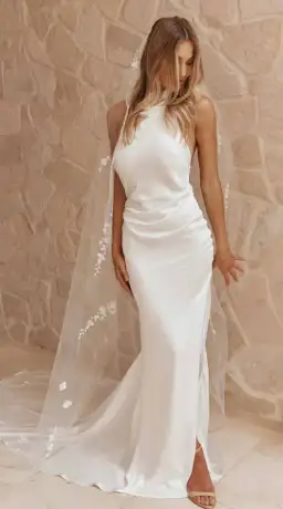 Fall in love with one of our favourite silhouettes, Goldie. Crafted from pearlescent satin, this halter-neck wedding dress is a flattering silhouette, featuring a dramatic low back and draped neckline.