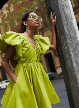 - This mini dress has been constructed in a showstopping fit-and-flare silhouette with exaggerated tulip sleeves, a deep scoop neck and back and oversized self tie drawcord through the back. Pair with strappy heels and a hand held clutch to turn heads at your next event.