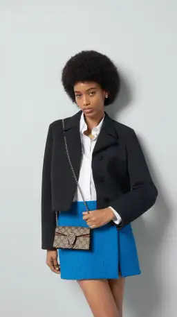 A structured GG Supreme canvas chain super mini shoulder bag with a key ring that can be used to attach this bag to a separate larger bag. The closure has the textured tiger head spur closure-a unique detail referencing the Greek god Dionysus, who in myth is said to have crossed the river Tigris on a tiger sent to him by Zeus. The accessory can also be worn as a crossbody bag.