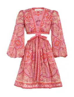The Halcyon Tie Front Mini Dress in Pink/Purple Paisley from Zimmermann's Summer Swim 2023 Collection. A cotton voile mini dress featuring a plunging V-neckline, finished with a cutaway waist and back.