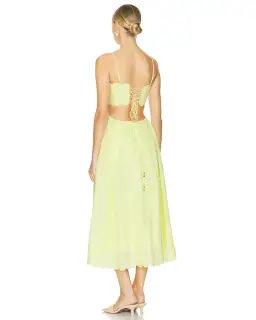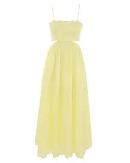 The Halliday Scallop Midi Dress in Yellow from our Summer Swim 2024 Collection. A linen midi dress featuring waist cut outs, side seam pockets and lace up back bodice, finished with embroidered scalloped edging throughout.