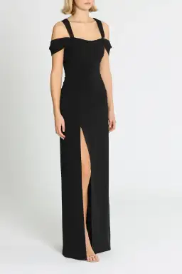 Embrace a sleek and contemporary classic look with a black gown featuring cold shoulder satin straps, a fitted silhouette, and a striking thigh-high leg split. Perfect for renting at black tie events or awards ceremonies.