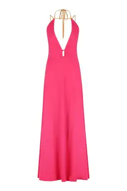 The Charlee Dress, a Maxi Dress cut in the Magenta colourway with contrasting Mango straps. Featuring a deep CF keyhole, knot detailing at the top of the dress and open low back. The perfect dress for your Summer occasions.