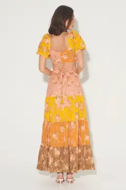 "The Mae Skirt is our gorgeous tiered maxi skirt cut in our multi floral print. The high waisted fit is complimented by heavily gathered panels that create a full hemline. The waistband includes an attached waist tie to wrap and accentuate the waist further.