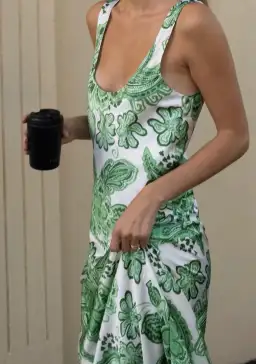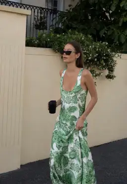 Classic silhouettes meet tropical motifs with the Patricia Bias Cut Maxi Dress in Greenhouse by Hansen & Gretel. Carefully crafted from a silk blend, this relaxed maxi dress features a low scoop and front-back neckline before cascading into a full hem with an asymmetrical panel line.