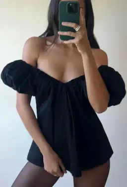 The Thandie Top is a structured top with oversized puff sleeves. It is heavily gathered and tucked along the neckline to flatter the figure. The neckline is elasticated and can be worn off the shoulder, making it a versatile styling piece for day to night.